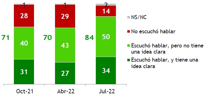 De acuerdo a la última encuesta de Equipos Consultores, el conocimiento sobre la intención del gobierno uruguayo de firmar un TLC con China ha aumentado en los últimos meses: el 34% dice haber escuchado hablar y tener una idea clara sobre el tema, 50% sostiene que escuchó hablar, pero no tiene una idea clara y un 14% no escuchó hablar sobre el tema. En total, un 84% de los encuestados escuchó hablar sobre el tema, porcentaje que aumentó significativamente desde que ingresó el tema en agenda, en el segundo semestre de 2021. Sin embargo, el conocimiento sigue siendo mayoritariamente vago, solo un 34% dice tener una idea clara sobre el tema.