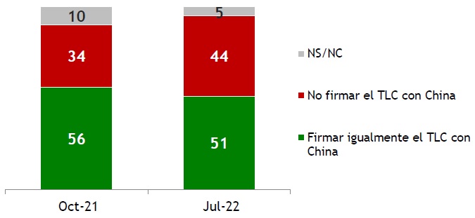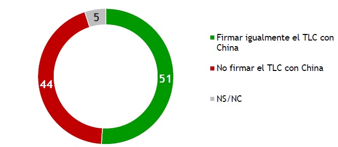 Al preguntar sobre si se estaría de acuerdo o en desacuerdo con firmar un TLC con China, el 60% de los encuestados dijo estar de acuerdo, 20% ni de acuerdo ni en desacuerdo, 12% dijo estar en desacuerdo y el restante 8% no opinó. La opinión favorable a firmar el TLC es ampliamente mayoritaria en la población, y el desacuerdo muy minoritario (12%).
