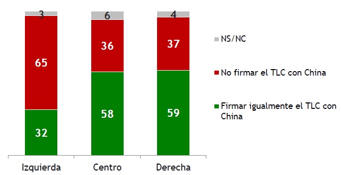 La firma o no del TLC con China ante la no autorización del MERCOSUR es el factor de mayor división ideológica y política respecto al tema en la población, más incluso que la conveniencia o las implicancias de firmar o no un TLC con China. Pero el alineamiento no es absoluto. Tanto en la izquierda como en la derecha hay un grupo de alrededor de un tercio que tiene una visión diferente a la de la mayoría de su segmento.