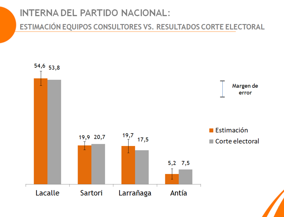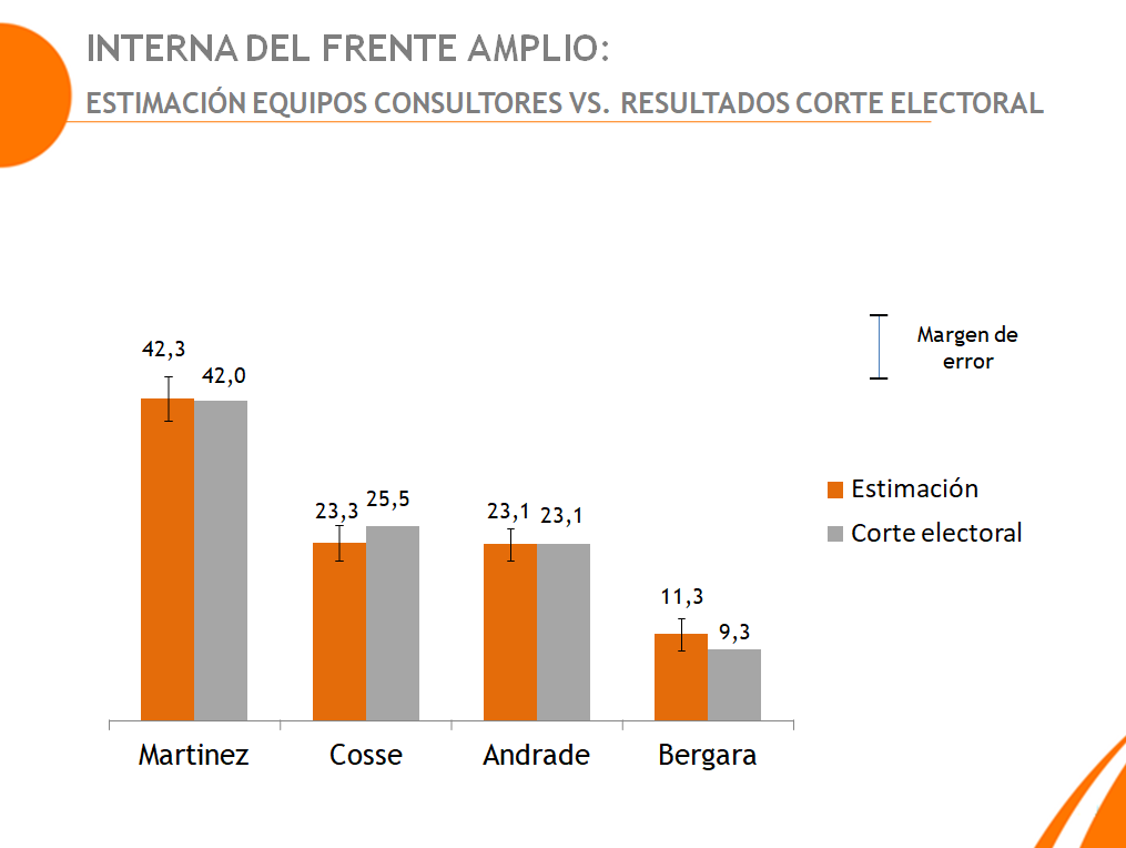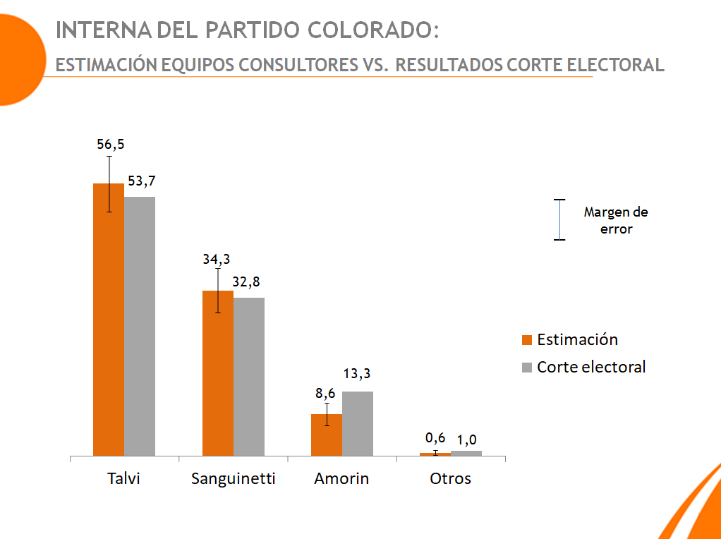 En este espacio comparamos nuestra estimación de conteo de escrutinio, con una muestra representativa de 100 circuitos en todo el país, con los resultados de la Corte Electoral. Queremos destacar la gran labor de todo nuestro equipo de trabajo, encuestadores, técnicos e investigadores, encargados del área de sistemas y soporte, estadísticos,recursos humanos, así como a todos los que conforman Equipos Consultores que de un modo u otro han apoyado toda la logística.