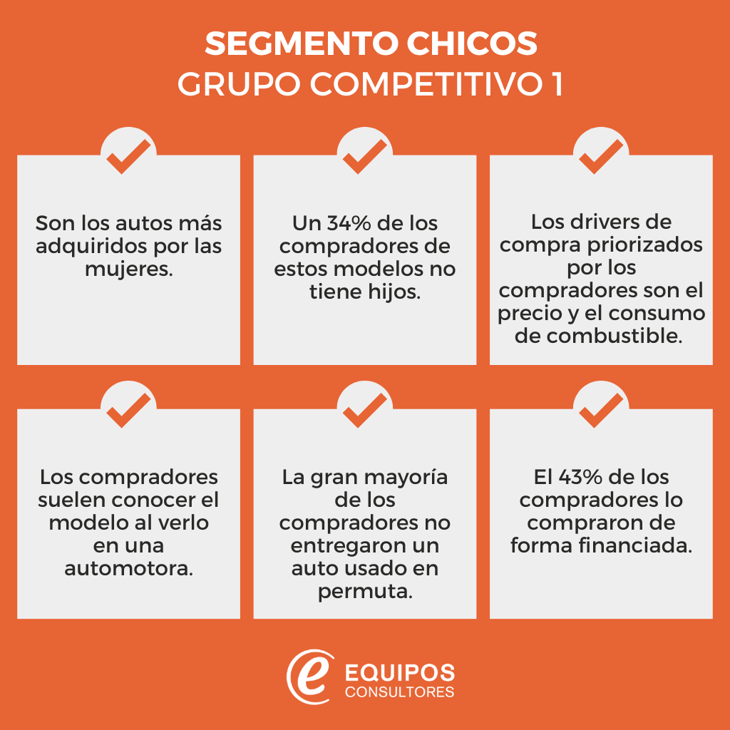 El primer grupo competitivo distinguido es el del segmento chicos, que incluye 14 modelos de 8 distintas marcas: Chevrolet Joy, Fiat Argo, Fiat Mobi, Hyundai Atos, Hyundai Grand i10, Kia Picanto, Kia Río, Nissan Note, Nissan March, Suzuki Alto, Suzuki Celerio, Suzuki S-Presso, Renault Kwid, y Volkswagen Up.