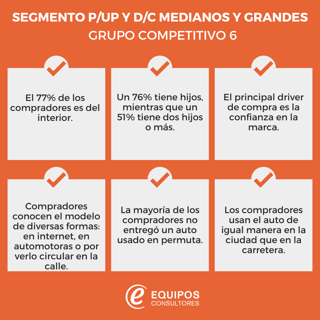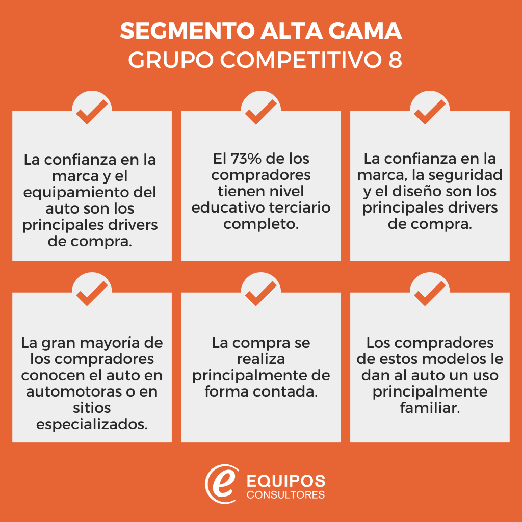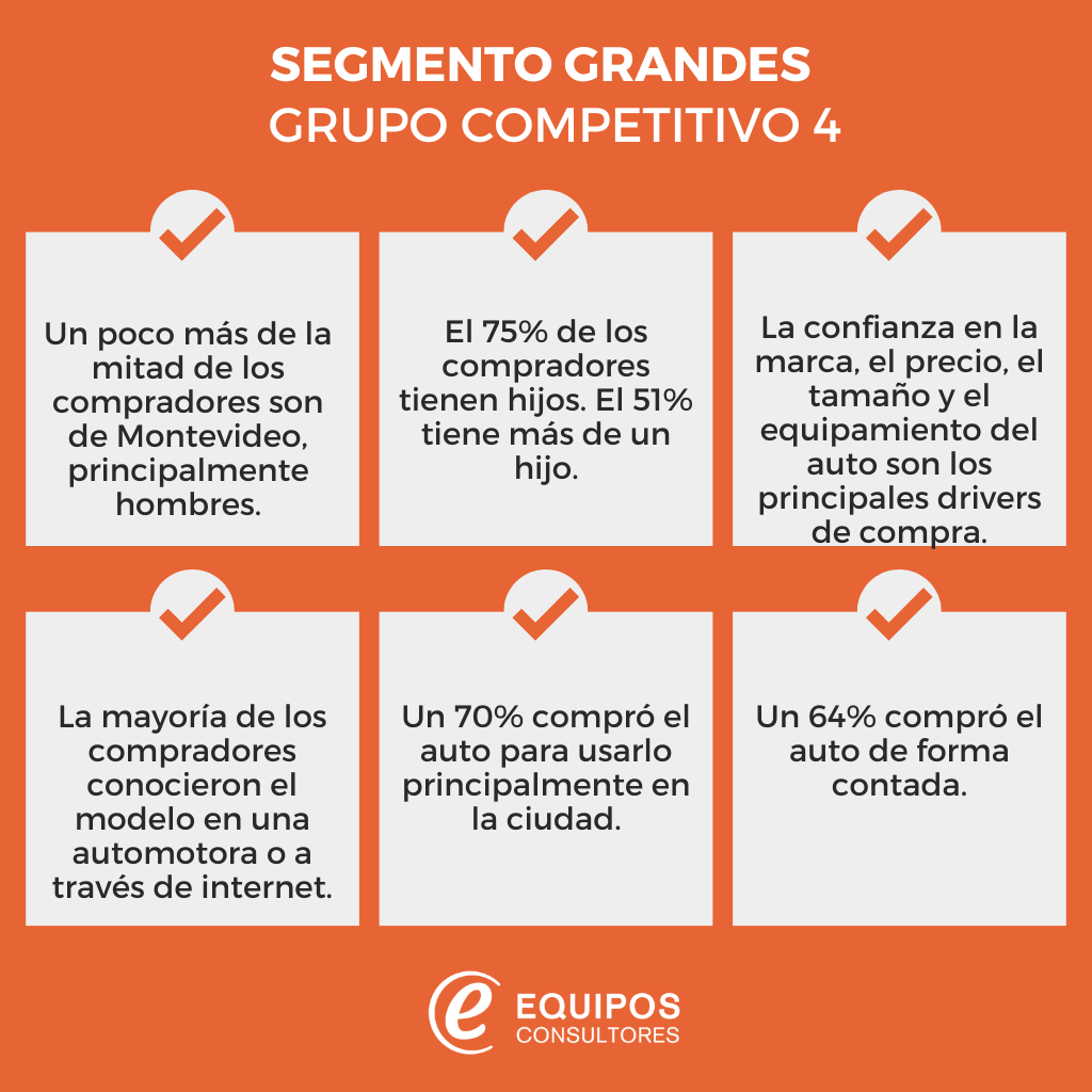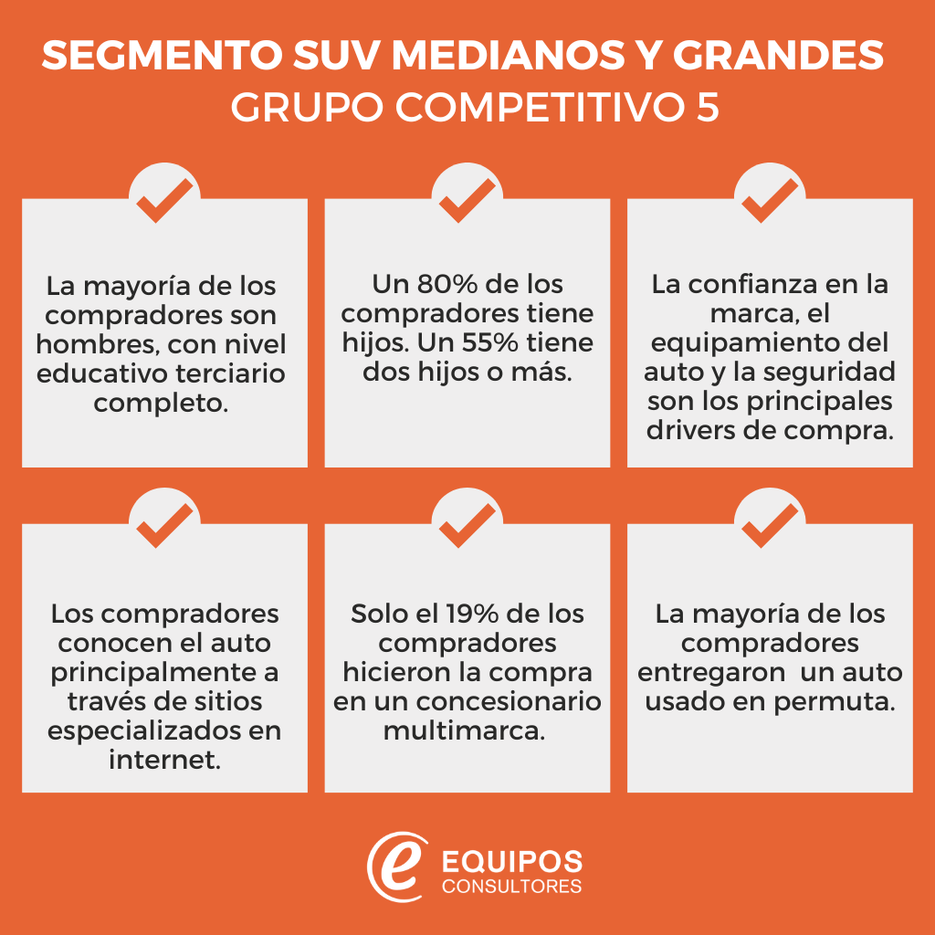 El informe cuenta con diferentes enfoques. Se distinguieron 9 grupos competitivos de modelos de automóviles. Para ello, se tuvieron en cuenta, por un lado, distintas características de los compradores de cada modelo, tales como el género, la edad, el nivel educativo, la cantidad de hijos, el presupuesto disponible y la finalidad para la que se compró el auto. También se estudiaron otros aspectos que influyeron en la decisión de cada comprador, como lo son los drivers de compra, la forma en la que conoció el modelo, el lugar en donde realizó la compra y la forma en la cual pagó el auto.