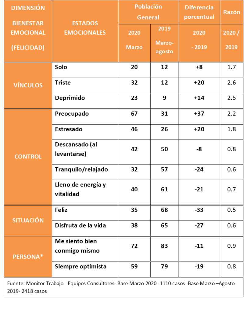 Tabla 1. El bienestar emocional de la población uruguaya, antes y durante el COVID-19. Población mayor de 18 años. Marzo, 2020 y marzo-agosto 2019.