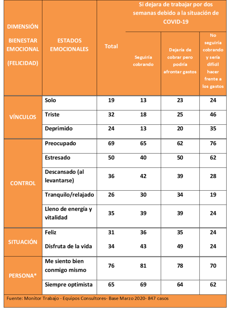 Ahora bien, la resiliencia de los seres humanos es una fuerza fundamental, y ello explica que incluso en estos casos de adversidad manifiesta, las personas no se derrumben y sigan creyendo, aunque en menor proporción, en su auto estima personal (70%) y en su optimismo (62%). No sucede así, como hemos visto antes, con las emociones de situación que, entre estos trabajadores, es decir, entre quienes creen que dejarán de percibir su salario, y quienes no podrán afrontar los gastos, solamente un 34% se sienten felices, y solamente un 24% declaran tener la sensación de disfrutar de la vida. Aquí la debacle del bienestar emocional es evidente. En comparación con la población general, estos porcentajes se reducen a un tercio, lo que da cuenta de la situación personal a la que se enfrentan estos trabajadores y sus familias.