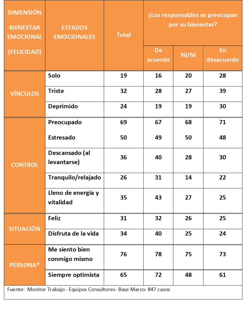 No es necesario señalar todos los porcentajes de la tabla, porque es evidente que los trabajadores de empresas que apenas se preocupan por el bienestar de sus empleados muestran un menor nivel de bienestar emocional. Los porcentajes correspondientes a estados emocionales negativos, sean la tristeza, la depresión o la soledad, aumentan, mientras que los porcentajes de los estados emocionales positivos, como el disfrute, el optimismo, o el sentirse descansado por las mañanas, disminuyen.