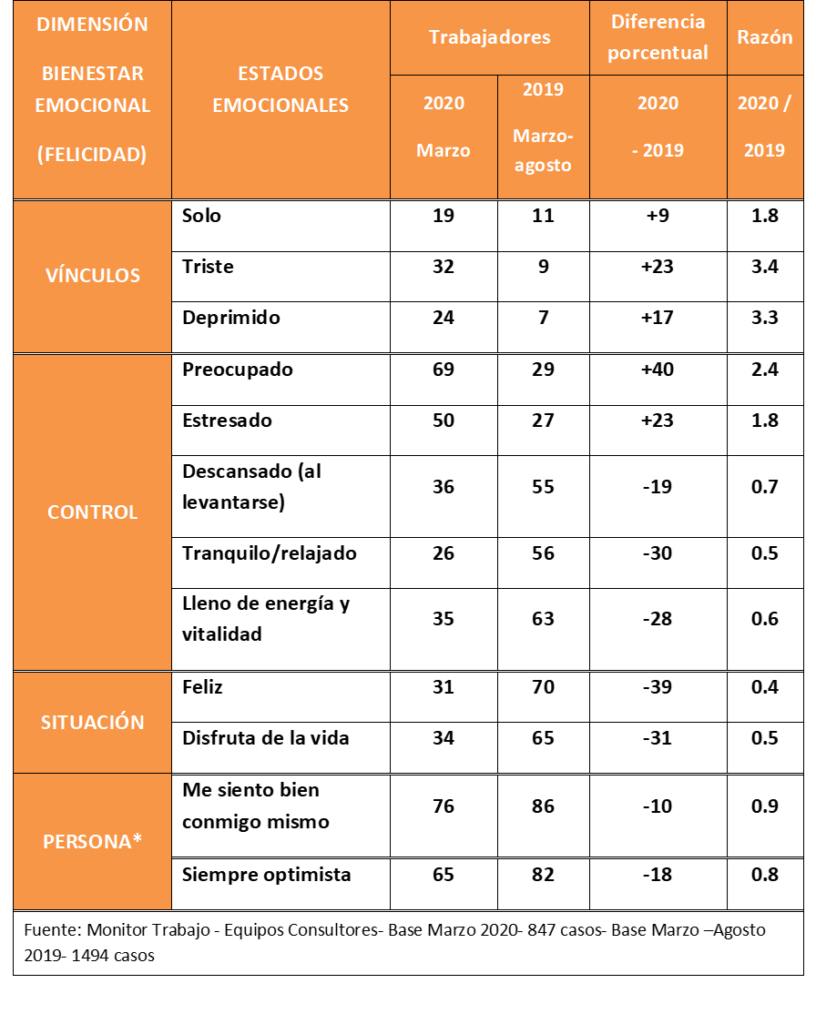 Tabla 2. El bienestar emocional de los trabajadores uruguayos antes y durante el COVID-19. Marzo, 2020 y marzo-agosto 2019.