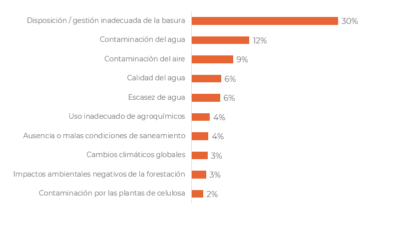 Entre los principales problemas ambientales percibidos, la “disposición y la gestión de la basura” y los “problemas vinculados al agua (contaminación, escasez y calidad)” se han consolidado como los principales problemas ambientales del país. De hecho, desde la década de los 80’, diferentes estudios ubican al problema de la gestión de los residuos como el problema ambiental por excelencia.