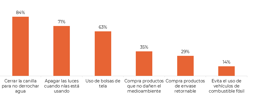 Acciones tales como el cuidado de la energía eléctrica o del agua, suelen realizarse por un gran porcentaje de la población y así se observa en las últimas mediciones. El uso de la bolsa de tela, que significaría una reducción en el uso de bolsas de plástico, se ha mantenido estable cerca del 60%. Sin embargo, son considerablemente inferiores los porcentajes de personas que realizan algunas otras prácticas, tales como clasificación de residuos, actividades de reciclado, elección de productos en envases retornables o envases reciclados.