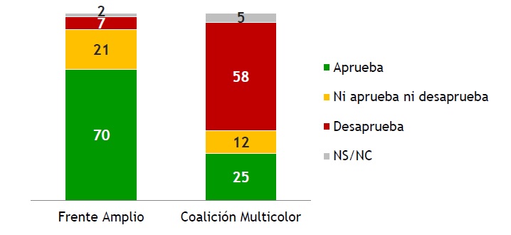 Cuando se analizan los datos por categorías sociales y políticas se aprecian dos clivajes significativos. En primer lugar, esperablemente, hay variaciones en función de las orientaciones políticas medidas en función del voto anterior. Entre los votantes del Frente Amplio Cosse recibe una aprobación mayoritaria (70% de respaldo), mientras que entre los votantes de la Coalición Multicolor recibe mayoritaria desaprobación (58%).