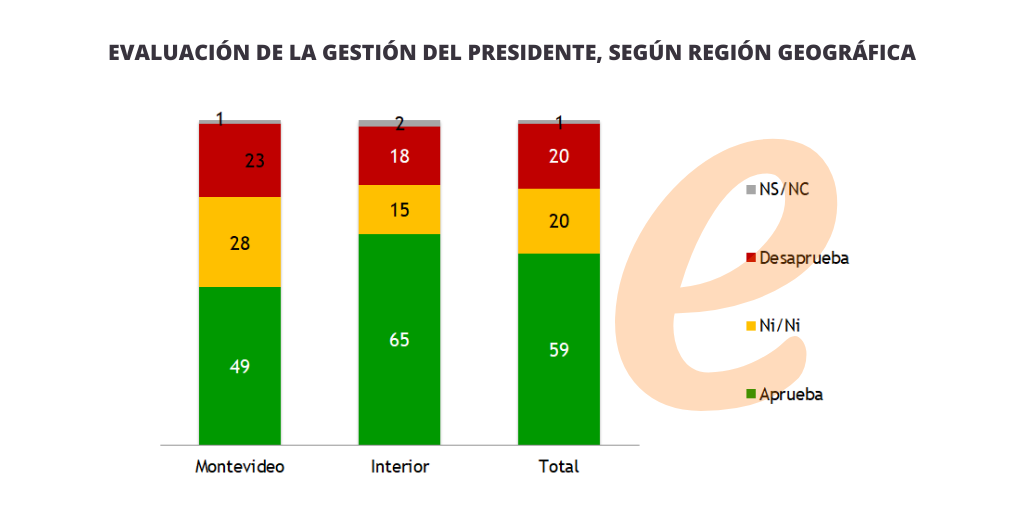 Por último, los juicios positivos sobre el Presidente son más intensos en el interior del país (65%) que en Montevideo (49%) pero, incluso en la capital, el balance de aprobación que recibe el Presidente en estos primeros cuatro meses de gestión es ampliamente positivo (49% aprobación contra 23% de desaprobación).