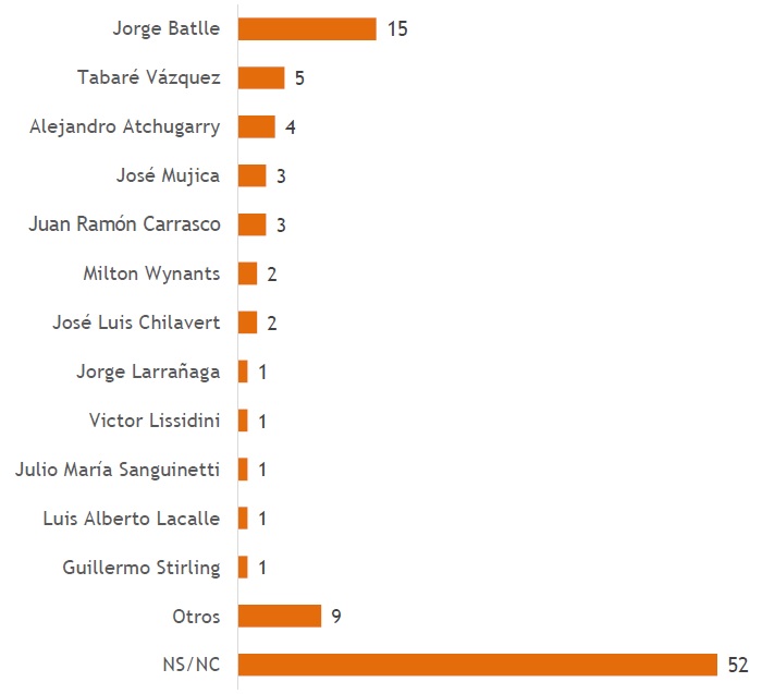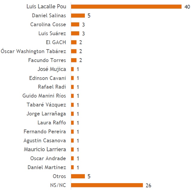 Luego de ellos, una amplia variedad de nombres apareció mencionado con 1%. Muchos de ellos son líderes políticos, ya sea oficialistas o de la oposición. Destacan las referencias a dos figuras desaparecidas recientemente, el ex presidente Tabaré Vázquez y el ex ministro del Interior Jorge Larrañaga. Además, son mencionados algunos referentes del oficialismo como el Senador Guido Manini Ríos, o la ex candidata a la Intendencia de Montevideo Laura Raffo. Entre las figuras destacadas de la oposición aparecen el senador Mujica, el flamante presidente del Frente Amplio Fernando Pereira, el senador Oscar Andrade y el ex candidato presidencial del FA Daniel Martínez. Además, un par de figuras adicionales del mundo del deporte: el jugador celeste Edinson Cavani, y el director técnico de Peñarol Mauricio Larriera. Y, por último, un único representante del universo artístico: Agustín Casanova, que recibió menciones exclusivamente entre población joven de Montevideo. La escasa participación de figuras públicas del mundo artístico no es una novedad en Uruguay, pero no deja de llamar la atención en un año en el que diferentes artistas uruguayos tuvieron destaques importantes e incluso reconocimientos y premiaciones internacionales.