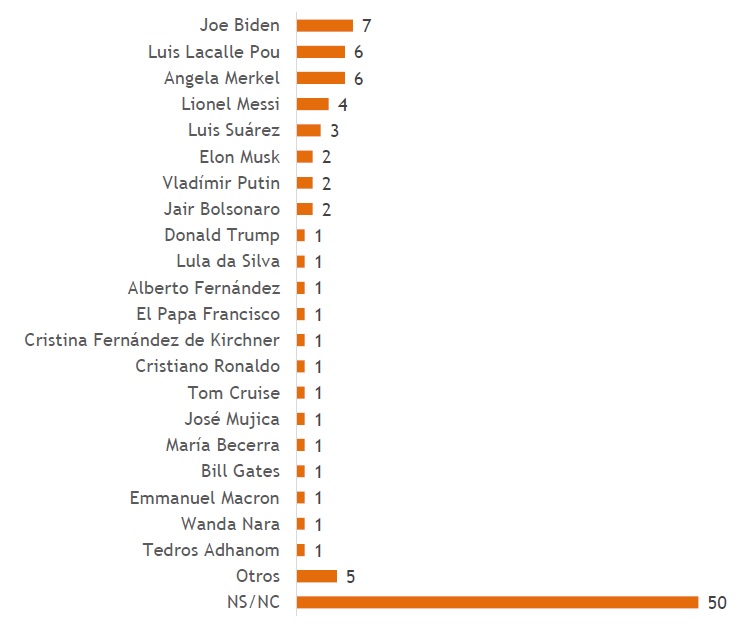 En el plano internacional los uruguayos en general tienen menores niveles de opinión, y las respuestas están más dispersas. El primer lugar, con 7%, lo obtiene el presidente norteamericano Joe Biden, que asumió su rol en enero de 2021 luego de ganarle la elección a Donald Trump.