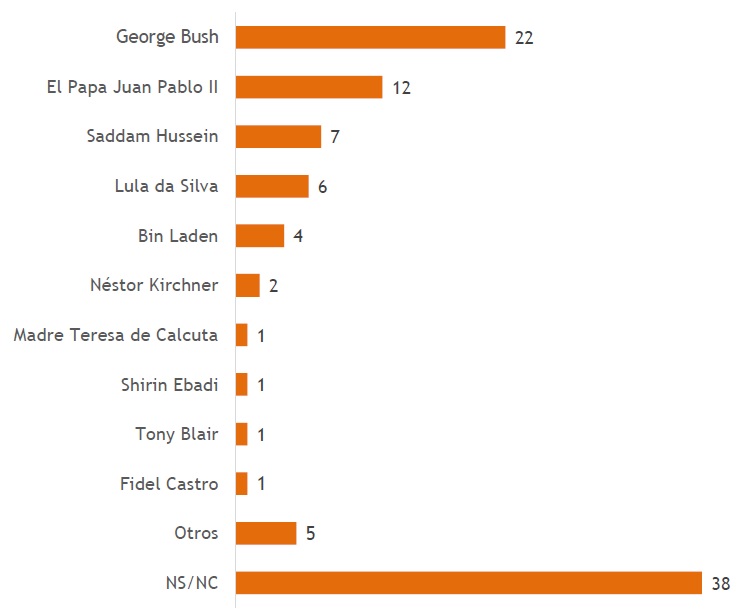 En el plano internacional, el mundo estaba en años convulsionados por la invasión de Estados Unidos a Irak. Todas las primeras menciones tienen que ver con ese hecho, lo que muestra el nivel de centralidad que estos acontecimientos tuvieron en nuestro país. Los uruguayos mencionaban al presidente norteamericano George Bush (que fue quien lideró la invasión), al Papa Juan Pablo II (que desde su lugar se oponía firmemente a la misma), al presidente irakí Saddam Hussein (que fue finalmente derrocado y capturado en diciembre de ese año), y al líder de Al Qaeda Bin Laden (que reivindicaba la autoría de los atentados de 2001 contra las Torres Gemelas). También aparecían menciones a la Premio Nobel de la Paz de ese año, la Iraní Shirin Ebadi, quien alegaba fuertemente contra la invasión norteamericana, y al Primer Ministro inglés Tony Blair, quien había apoyado a Bush en la invasión a Irak.