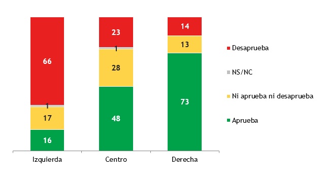 Adicionalmente, las miradas difieren fuertemente según la orientación ideológica de los entrevistados. Dentro de los uruguayos que se identifican a sí mismos con la “izquierda” o la “centro-izquierda”, predominan fuertemente los juicios críticos (16% aprueba y 66% desaprueba), con un saldo neto de -50. En cambio, entre los orientados a la “derecha” y “centro-derecha”, los resultados son prácticamente simétricos e inversos (73% de aprobación y 14% de desaprobación), con un saldo neto de +59. Finalmente, entre los identificados con el “centro” hay juicios más divididos pero de balance positivo (48% de aprobación y 23% de desaprobación), arrojando un saldo neto de +25.
