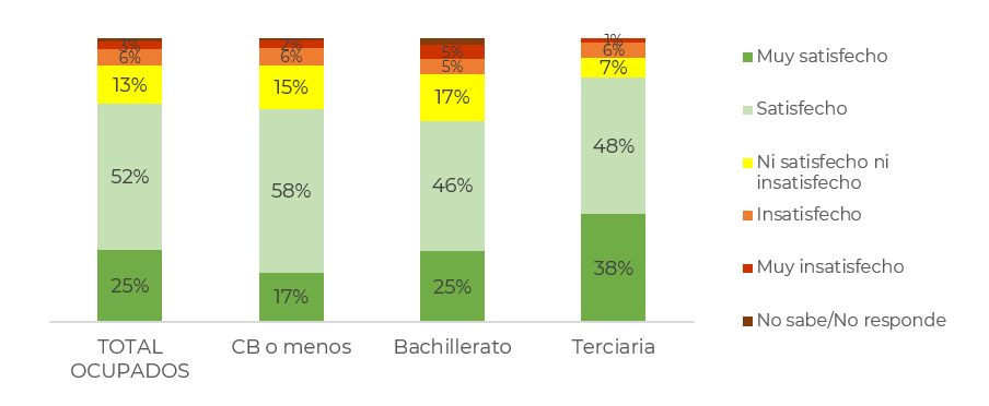 En el indicador de satisfacción con el trabajo también se pueden apreciar diferencias según nivel educativo. En este indicador alrededor del 80% de las personas ocupadas se encuentran satisfechas con su trabajo, y de ellas un 25% dice estar muy satisfecha. Se trata de un indicador que suele ser tomado como una medida de bienestar laboral subjetivo. Estudios anteriores realizados por Equipos Consultores muestran que la satisfacción está determinada por el sentido y utilidad del trabajo que se hace y por el respeto que socialmente se tiene a la actividad. Con claridad, las personas trabajadoras de niveles educativos más bajos están menos satisfechas que el resto: entre las personas con educación terciaria el 40% menciona estar muy satisfecho mientras que entre las personas con ciclo básico o primaria apenas el 17% se reconoce muy satisfecho. Estos resultados no resultan llamativos si se considera lo anterior, y que las personas más educadas se desempeñan en actividades o sectores que por lo general, tienden a ser destinatarios de una mayor estima social (salud, educación, tics, entre otros).