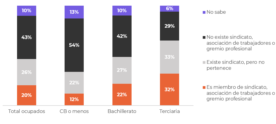 Las posibilidades percibidas de encontrar un buen trabajo tienen un comportamiento bastante similar al constatado en el indicador asociado a la preocupación de perder el trabajo actual. Casi un 20% de las personas ocupadas entrevistadas dicen que no tienen ninguna posibilidad de encontrar un buen trabajo. Es clara la diferencia en esta posibilidad entre los distintos segmentos de personas trabajadoras: entre las personas de nivel educativo bajo las posibilidades de conseguir un buen trabajo son casi inexistentes para 1 de cada 4 personas trabajadoras.