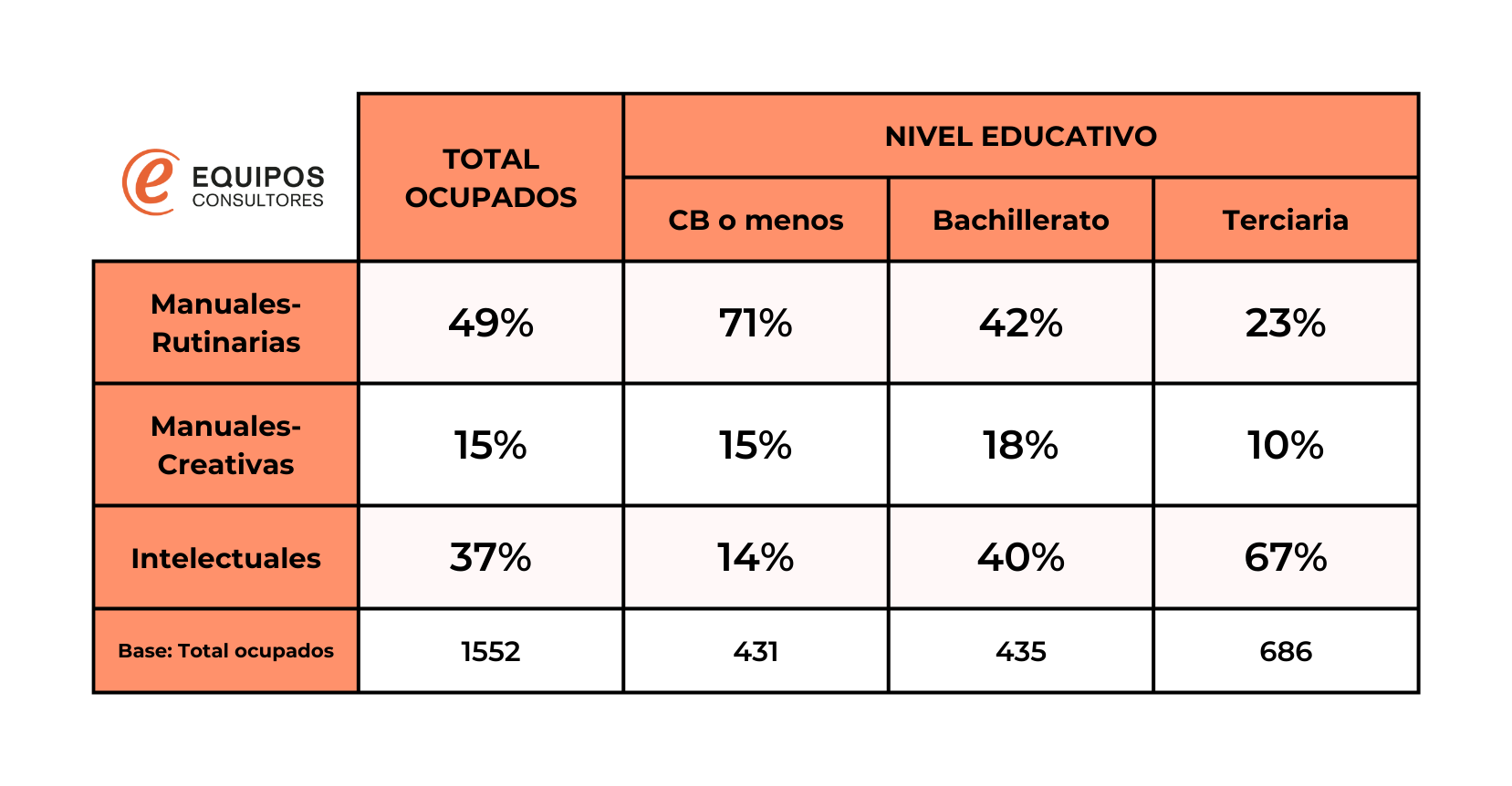 Este primer indicador presenta una situación de heterogeneidad en lo que respecta al conjunto de los ocupados, donde más de la mitad dice realizar tareas manuales, fundamentalmente rutinarias. La concentración de los trabajadores de niveles educativos más bajos es clara, más del 70% de ellos realizan este tipo de actividad frente a un 23% de trabajadores con formación terciaria que mencionan realizar actividades manuales rutinarias. Este indicador plantea un estado de situación, ya advertido por algunos estudios que se han orientado a investigar las consecuencias de la incorporación del cambio tecnológico, en particular los procesos de automatización, aspecto sobre el cual vuelve a llamar la atención la incorporación de herramientas de inteligencia artificial que se han extendido más recientemente como por ejemplo el CHAT GPT que podría tener la potencialidad de alcanzar también a quienes realizan tareas intelectuales.