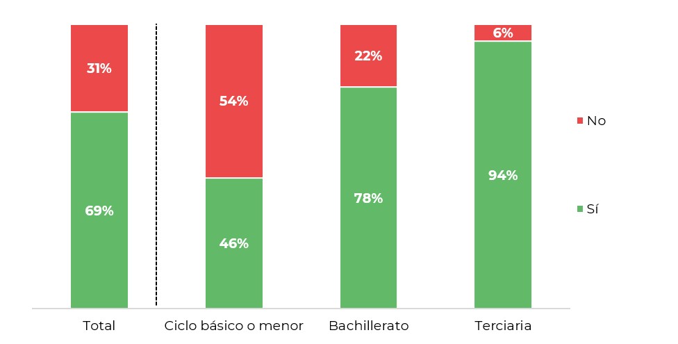 El conocimiento sobre inteligencia artificial alcanza a buena parte de la población trabajadora: aproximadamente un 70% dice haber visto, leído o escuchado hablar de IA. Se aprecia una fuerte segmentación del conocimiento declarado según el nivel educativo de las personas trabajadoras: el 94% de quienes tienen un nivel educativo terciario declaran conocer algo de inteligencia artificial, mientras que este porcentaje desciende casi a la mitad de quienes tienen educación media básica o menor nivel educativo.