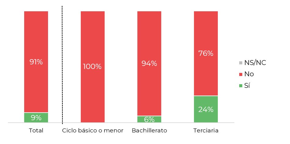 El mismo patrón se observa al consultar sobre el uso de la IA en el trabajo, el 11% de quienes trabajan declaran haber usado alguna herramienta de inteligencia artificial en su trabajo con una clara diferencia de declaración entre quienes tienen un nivel medio y alto frente a los niveles más bajos.