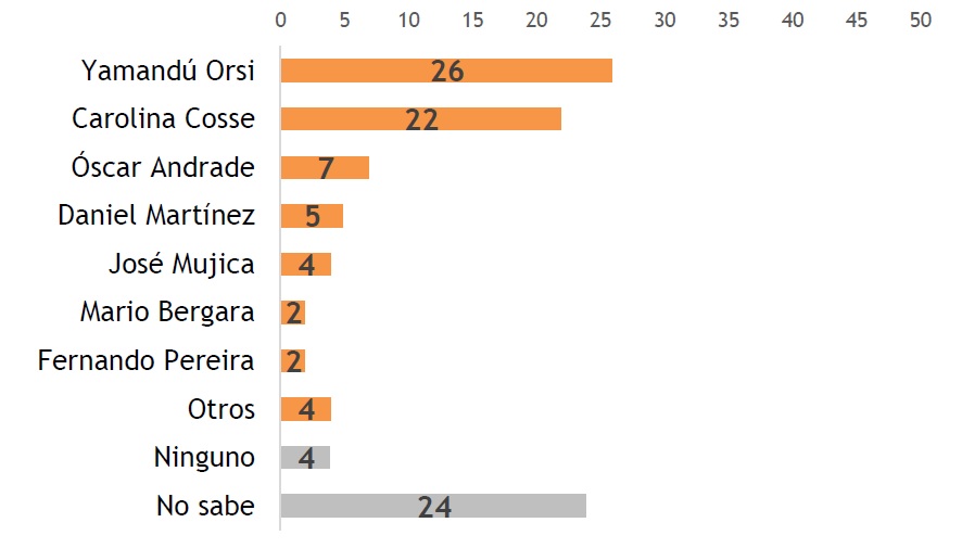 Cuando se realiza la pregunta sin mencionar candidatos, las preferencias en la interna del FA están lideradas por Yamandú Orsi con 26%, seguido de Carolina Cosse con 22%. Significativamente por debajo aparecen otros potenciales precandidatos como Oscar Andrade (7%) o Mario Bergara (2%).