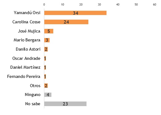 Cuando se pregunta a los frenteamplistas su preferencia en forma espontánea, Yamandú Orsi es el candidato más mencionado (34%), seguido de Carolina Cosse (24%), y bastante más lejos vienen otros candidatos como Mario Bergara (3%), junto con ex candidatos (José Mujica, Danilo Astori, Daniel Martínez) que no estarán en la contienda, y otros actuales líderes que tampoco competirán, (como Óscar Andrade y Fernando Pereira). Hay uno de cada cuatro frenteamplistas que no tiene opinión al respecto (23% no saben, y 4% dice que ninguno), lo que refleja la razonable incertidumbre que una parte del electorado tiene sobre la competencia, faltando todavía un año para la elección.