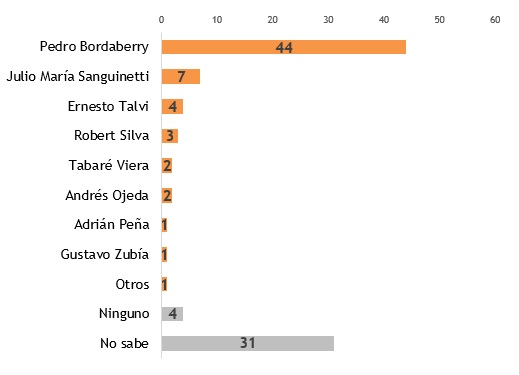 Entre los colorados, el escenario espontáneo es liderado con holgura por Pedro Bordaberry con 44% de las preferencias. Mucho más abajo aparecen algunos ex candidatos (Julio María Sanguinetti con 7% y Ernesto Talvi con 4%), o posibles candidatos (Robert Silva, Tabaré Viera, Andrés Ojeda, Adrián Peña o Gustavo Zubía). Más de la tercera parte de los colorados (35%) no manifiesta preferencia espontánea por candidatos a esta altura.