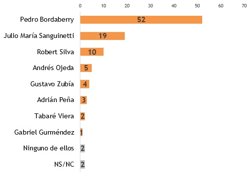 o Y entre los siguientes nombres, ¿a cuál preferiría? (Categorías de respuesta: 1. Pedro Bordaberry, 2. Julio María Sanguinetti, 3. Adrián Peña, 4. Robert Silva, 5. Gustavo Zubía, 6. Andrés Ojeda, 7. Gabriel Gurméndez, 8. Guzmán Acosta y Lara, 9. Ninguno de ellos, 10. NS/NC