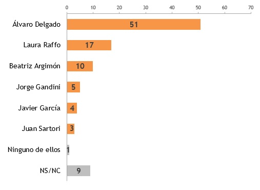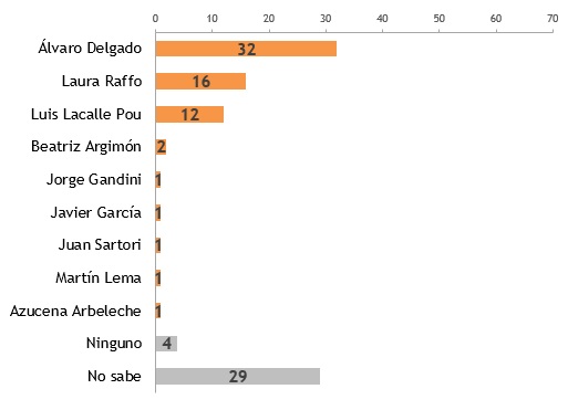 Cuando se presenta un escenario guiado con seis candidatos o posibles candidatos, Delgado obtiene una diferencia mucho más amplia. Lidera la interna con 51% de las adhesiones contra 17% de Laura Raffo, 10% de Beatriz Argimón, 5% de Jorge Gandini y 4% de Javier García, además de 3% a Juan Sartori. El nivel de no respuesta se reduce a 10%.