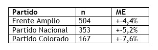 El universo de estudio de los datos presentados son todas las personas que se sienten “cercanas” o “muy cercanas” a cada partido político, mayores de 18 años y residentes en todo el territorio nacional. El número de personas encuestadas con esta característica para cada partido político y su respectivo margen de error máximo esperado dentro de un intervalo de confianza del 95% se observan en la siguiente tabla: