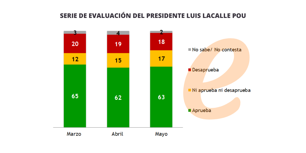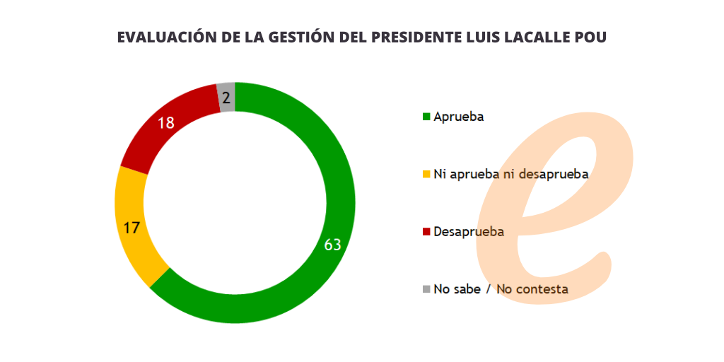 Al cumplirse los primeros 100 días de gobierno, los uruguayos mantienen el tono positivo a la hora de evaluar el desempeño del presidente Luis Lacalle Pou. En la última encuesta de Equipos Consultores, 63% de los uruguayos aprueba su trabajo, y 18% lo desaprueba, al tiempo que 17% tiene opiniones intermedias y 2% no manifiesta opinión. De esta forma, el saldo neto resultante (producto de restar la aprobación y desaprobación) es de 45 puntos positivos.