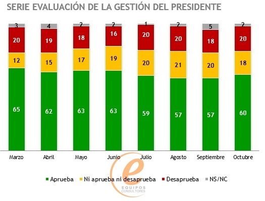 Los resultados son muy similares a los obtenidos en meses anteriores. Respecto a fines de setiembre, los juicios positivos aumentan 3 puntos (de 57% a 60%) y los negativos aumentan 2 (de 18% a 20%).