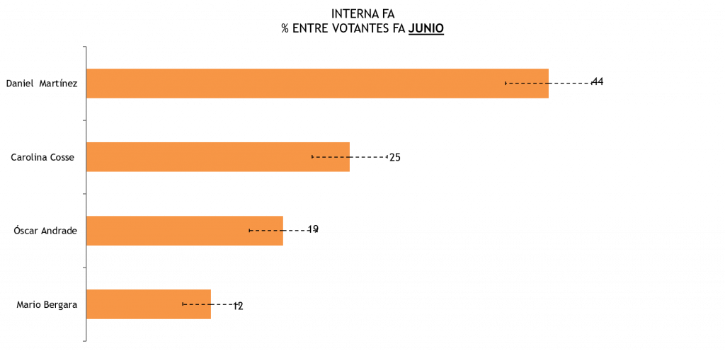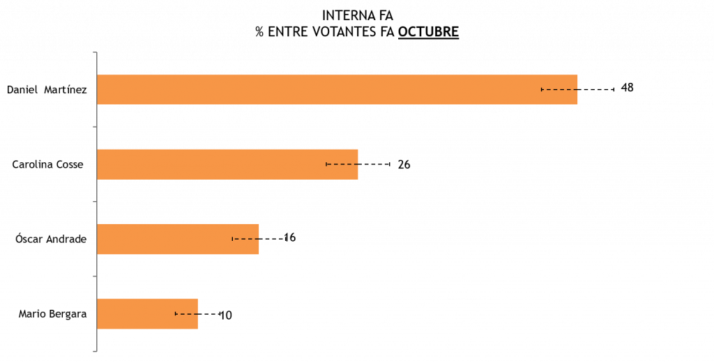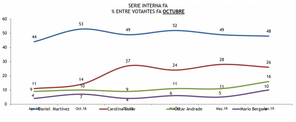 Si se analizan los resultados en el total de los votantes frenteamplistas de octubre, sin tener en cuenta su predisposición de ir a votar o no el domingo 30, Daniel Martínez recibe el 48% de las preferencias, contra 26% de Carolina Cosse, 16% de Oscar Andrade y 10% de Mario Bergara. Estas diferencias están por encima del margen de error, por lo que el orden de los candidatos en esta última “foto” es claro. La competencia en el FA ha sido estable, en términos generales, en los últimos meses, aunque en esta última medición, los candidatos minoritarios Andrade y Bergara han crecido algo respecto a las mediciones anteriores.