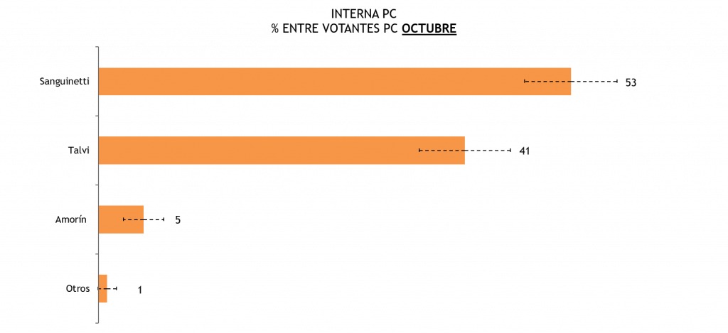 El bloque de la interna colorada presenta preguntas que fueron aplicadas solo a los votantes del Partido Nacional (935 casos en la estimación de votantes en octubre y 767 casos en la estimación de votantes en junio). Una muestra probabilística de 935 casos tiene un margen de error estimado de +- 3,2 considerando un intervalo de confianza del 95%, y para p=q=0,5, mientras que una de 767 casos tiene un margen de error estimado de +-3,5 considerando un intervalo de confianza del 95%, y para p=q=0,5