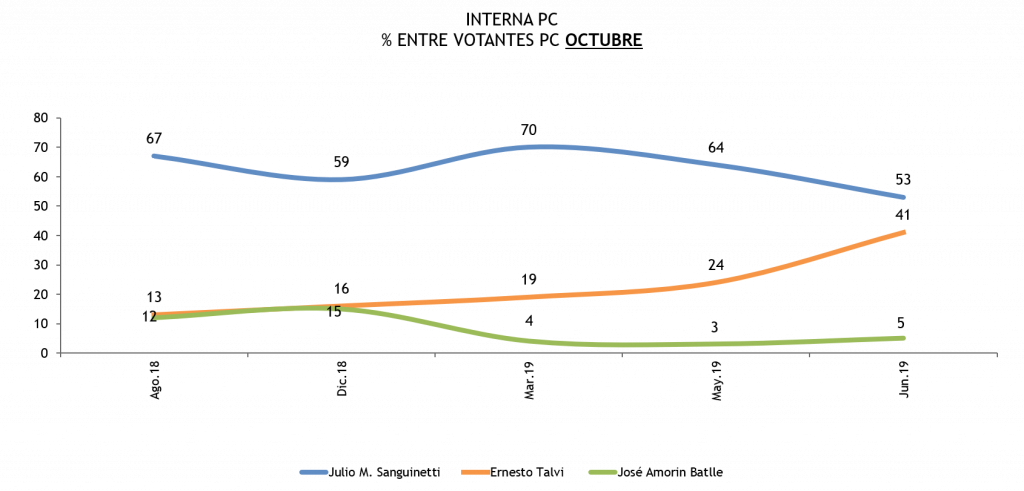Si se considera la opinión de todos los colorados (sin importar o no su voluntad de ir a votar el domingo 30), Sanguinetti mantiene una ventaja sobre Talvi: 53% a 41% respectivamente, contra 5% de Amorín Batlle, y 1% de los otros candidatos colorados. Esta diferencia, sin embargo, se ha reducido fuertemente respecto a la medición anterior. Sanguinetti pasa de tener una diferencia del entorno de 40 puntos a una diferencia algo mayor a 10 que, está apenas por encima del margen de error de la medición. El aumento de visibilidad de Ernesto Talvi en las últimas semanas ha sido acompañado por un aumento en las preferencias. Siempre advertimos que Talvi tenía un importante nivel de “convertibilidad” de conocimiento a votos, su desafío era lograr más conocimiento, y parece haberlo logrado en la recta final.