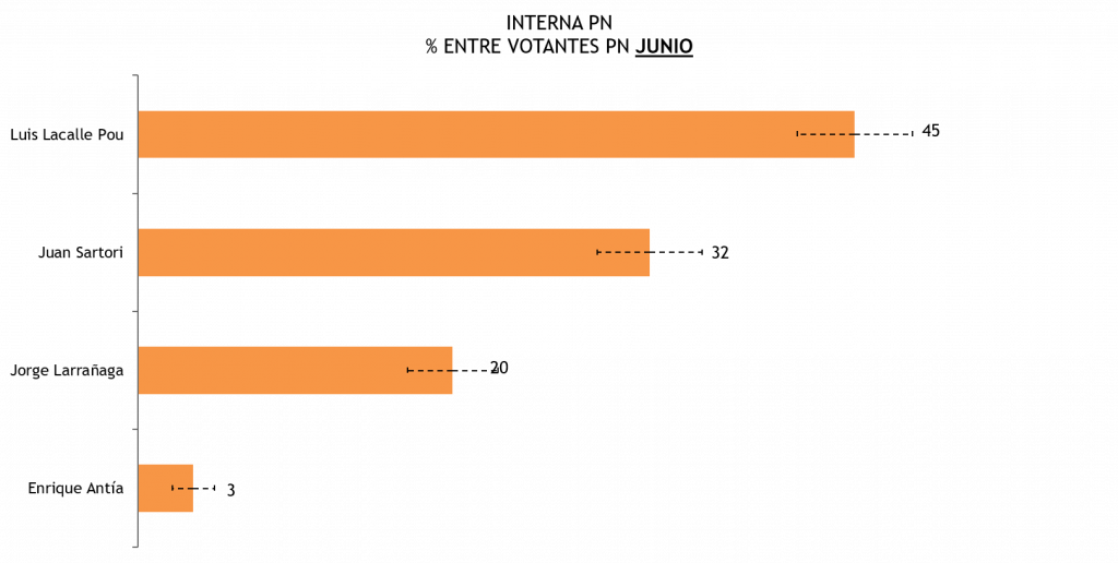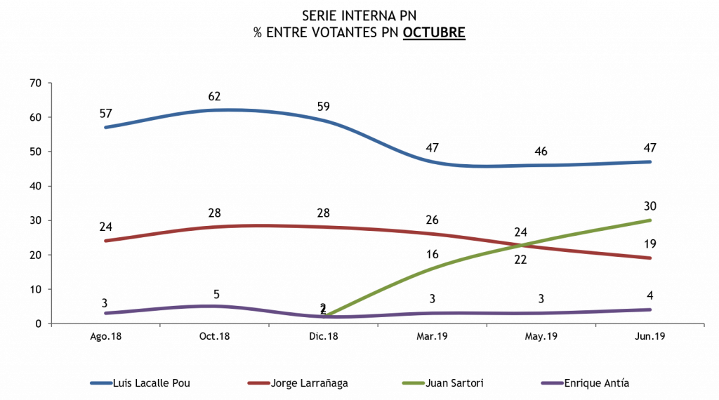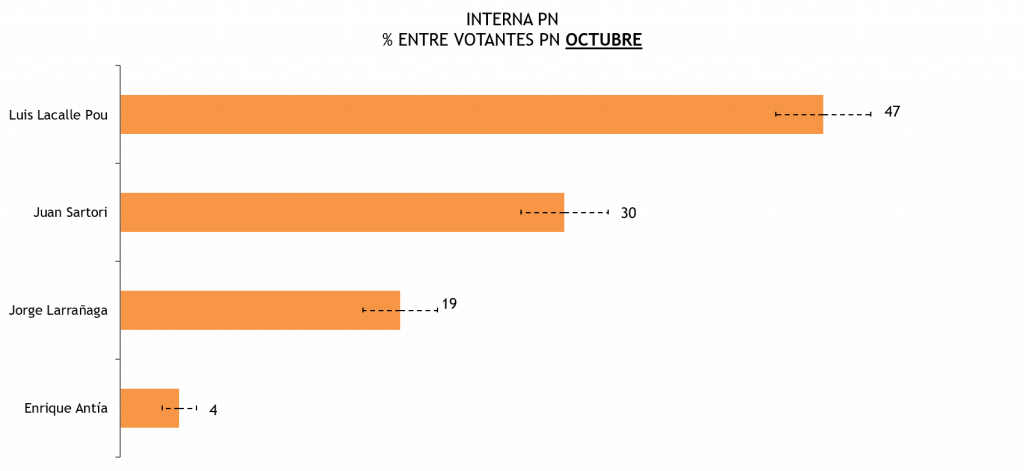 En la interna del Partido Nacional, cuando se considera la opinión del total de votantes blancos de octubre, la última “foto” antes de la elección muestra a Luis Lacalle Pou con 47% de las preferencias, a Juan Sartori con 30%, a Jorge Larrañaga con 19%, y a Enrique Antía con 4%. Las variaciones entre los candidatos están por fuera del margen de error de la medición, por lo que son estadísticamente significativas. El orden de los candidatos en la última “foto” parece claro.