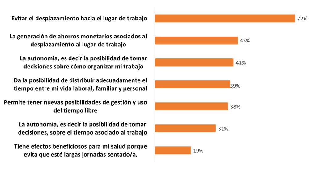 La mayor parte de los teletrabajadores por COVID19 señalan el evitar el desplazamiento al lugar de trabajo como una de las principales ventajas de esta modalidad (72%). Sin embargo, aparecen otras ventajas percibidas asociadas a la autonomía en la organización del trabajo y del tiempo de trabajo. Porcentajes cercanos al 40% señalan estas posibilidades como un aspecto positivo de esta modalidad. Ambas adquieren importancia a la luz del tipo de trabajador del que se trata, puesto que la autonomía en el trabajo es una de las dimensiones valoradas por los trabajadores más calificados y suelen estar presentes en el discurso managerial.