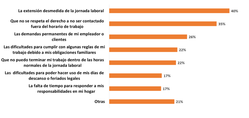 Se trata de un tipo de trabajador que se construye habitualmente en torno a esta capacidad, que por cierto es muy valorada en el mercado laboral, y que supone capacidad de autogestión por parte de los trabajadores. Si bien esta es una ventaja interesante, y abre oportunidades para gestionar de una forma alternativa tanto la actividad como los tiempos dedicados a la misma, no debe desconocerse que esta autonomía puede convertirse en un desafío para los trabajadores para mantenerse en condiciones que no supongan pérdidas de bienestar subjetivo. Cuando se observan las desventajas señaladas, surgen elementos que pueden poner en jaque el bienestar: la extensión desmedida de la jornada de trabajo (40%), el no respeto del derecho a no ser contactado fuera del horario de trabajo (35%), las demandas permanentes del empleador y/o cliente (26%) el no poder cumplir con el trabajo dentro de las horas normales (22%), las dificultades para dar respuesta a la carga de trabajo, entre otras.