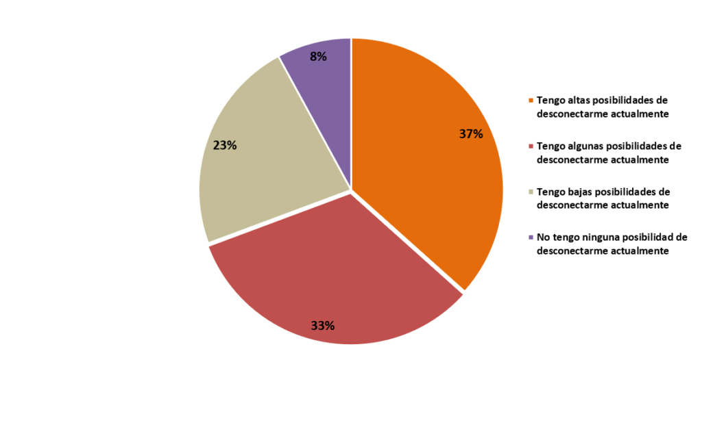 Si bien en este marco posiblemente hayan existido razones adicionales que dificultaran la realización del trabajo por tratarse de una crisis general, pareciera necesario encontrar mecanismos para que el teletrabajo no colonice la vida privada del trabajador y se convierta en una sobrecarga. De hecho si se observa el indicador asociado a las posibilidades de desconexión para garantizar el tiempo de descanso puede verse que hay una proporción importante de teletrabajadores por covid19 entienden que no tienen posibilidades reales de hacerlo o que éstas son muy bajas (31%). De ese conjunto de trabajadores con pocas posibilidades de desconectarse, un 8% dice que no tiene ninguna posibilidad. Por otro lado, casi un 40% de teletrabajadores declaran tener altas posibilidades de desconectarse, mientras que un 33% dice tener “algunas”. El derecho a la desconexión pareciera ser algo que está bastante lejos a distribuirse de forma homogénea dentro del colectivo que teletrabaja actualmente. Importante señalar que sobre este derecho se viene poniendo mucha atención por parte de los estudiosos del mundo del trabajo, y advirtiendo sobre su vulneración hace bastante tiempo a nivel internacional, puesto que es uno de los principales riesgos que tiene para los trabajadores la expansión tecnológica, junto a determinadas prácticas manageriales que individualizan las relaciones y están basadas en mecanismos de responsabilización de los trabajadores por los logros organizacionales.
