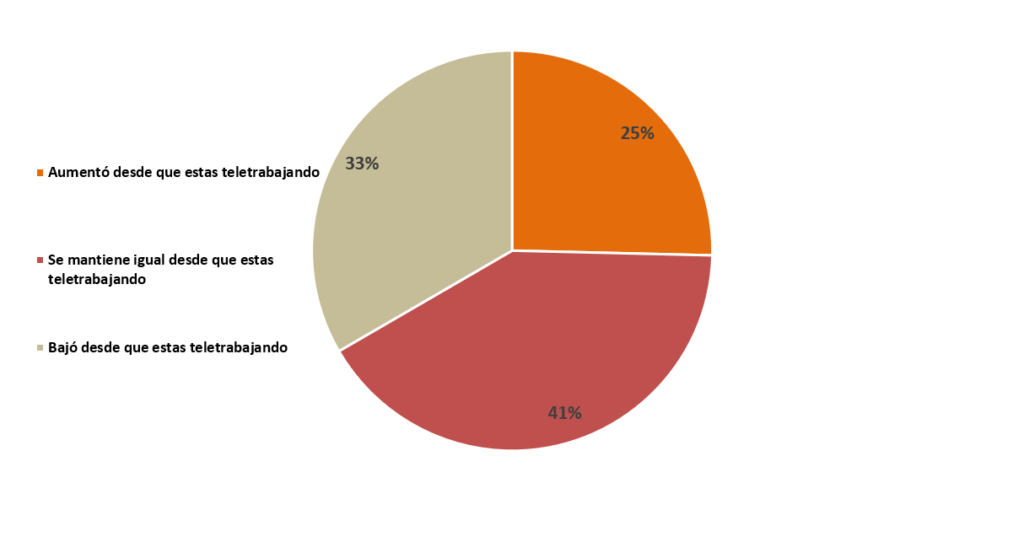 En lo que hace al vínculo con la organización, también es relevante conocer si se ha realizado alguna evaluación sobre la modalidad implementada. Concretamente, se indagó si la organización había realizado alguna evaluación sobre la implementación del teletrabajo en estas 4 últimas semanas. Más de la mitad de los teletrabajadores declara que no hubo evaluación, un 10% que se hizo una evaluación formal y un 32% que se realizó de manera informal. Esto también es importante puesto que en función de los datos anteriormente expuestos es una práctica que arrojaría información útil para las organizaciones y daría posibilidades de mejora de la situación y condiciones de trabajo de los teletrabajadores. Máxime si se observa que la percepción sobre la productividad de los teletrabajadores en este contexto está lejos de ser homogénea. Se trata de una dimensión sobre la que tampoco hay consenso a nivel de investigaciones anteriores y de hecho es una de las interrogantes sobre si las condiciones del teletrabajo son favorables a la productividad. Es muy importante reparar en que se trata de un indicador subjetivo de productividad, y por tanto, es una evaluación personal sobre la performance propia en este contexto y que puede estar influenciada por diversos factores como por ejemplo la presencia de menores a cargo, la superposición de responsabilidades asociadas a los distintos roles sociales que desempeñan los trabajadores, la capacidad de habituación a la situación generada por el covid19, entre otros. El 41% de los trabajadores sostiene que su productividad se mantiene igual desde que esta teletrabajando, frente a un 25% que sostiene que aumentó su productividad y un 33% que disminuyó desde que está teletrabajando.