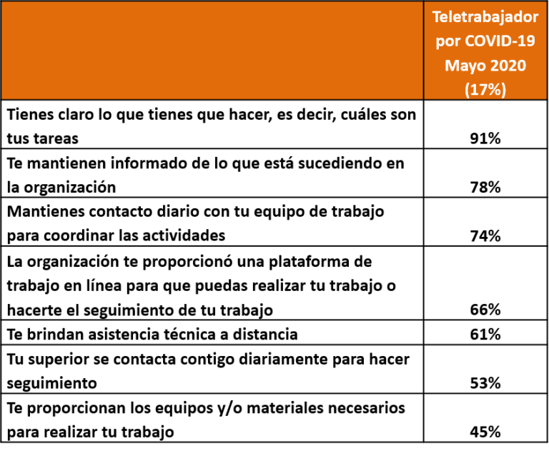 A nivel del vínculo entre el trabajador y la organización, puede decirse que en función de las practicas estudiadas, y lo visto anteriormente en términos de autonomía, se desprende que la modalidad de teletrabajo implementada está basada en una definición clara de tareas para el trabajador, al menos en términos declarados, donde también parece existir tanto un nivel relativamente alto de información sobre lo que está sucediendo en la organización y con un contacto diario con el equipo de trabajo que alcanza a 7 de cada 10 trabajadores. En algo más de la mitad de los casos, los superiores se contactan diariamente para hacer seguimiento del trabajo mientras que en el 41% de los casos le proporcionan los equipos y materiales necesarios para realizar el trabajo, en un estas parecen ser las practicas menos extendidas en este colectivo analizado.