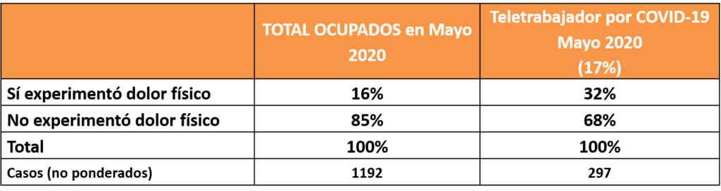 Nota: puede no sumar 100% por efecto redondeo. Pregunta: ¿Estas dos últimas semanas experimentaste algún tipo de dolor físico que puedas asociar a la actividad necesaria para realizar tu trabajo? Fuente: Monitor Trabajo Mayo 2020. Equipos Consultores.