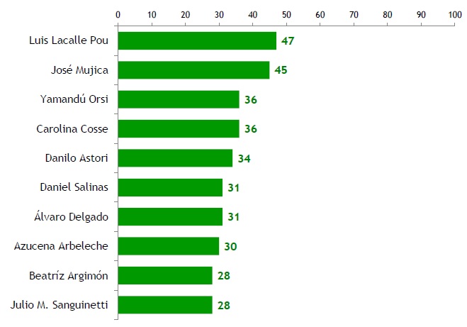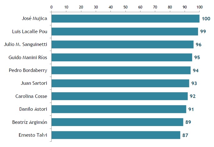El “top ten” de líderes políticos más conocidos en Uruguay está compuesto fundamentalmente por figuras que han tenido una trayectoria política relevante y, en casi todos los casos, han sido candidatos o pre-candidatos presidenciales (o presidentes) en al menos una oportunidad.
