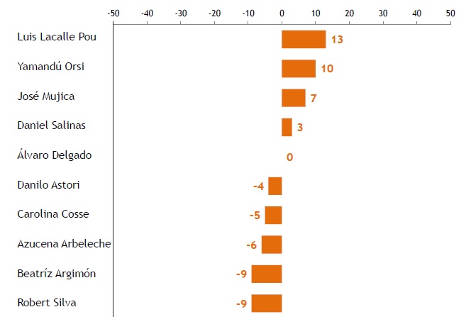 Los dos líderes de mejor saldo neto en Uruguay actualmente son el presidente Lacalle Pou (que recibe un +13) y Yamandú Orsi (+10). Esto es producto de que Lacalle recibe, como se mencionó anteriomente, 47% de simpatías y 34% de antipatías. Orsi recibe menos simpatías (36%) pero también menos antipatías (26%), por lo que el saldo neto de ambos es similar, a pesar de que el conocimiento de Lacalle Pou es significativamente mayor que el de Orsi. Por debajo de ellos aparece el ex presidente Mujica, y el ministro Salinas, que tienen saldos positivos de +7 y +3 (también con niveles de conocimiento muy distintos). El quinto lugar lo ocupa Álvaro Delgado, que tiene un balance neutro (exactamente 0), producto de 31% de simpatías e idénticas antipatías. Los otros cinco líderes que completan la lista de los más destacados en el balance tienen saldos negativos moderados: Danilo Astori, Carolina Cosse, Azucena Arbeleche, Beatriz Argimón, y Robert Silva. Este último caso es curioso. Silva no es de los líderes más conocidos, por lo que tampoco acumula un nivel de simpatías elevado. Pero recibe pocas antipatías, por lo cual a pesar de no estar en ninguno de los rankings anteriores aparece dentro de los destacados en saldo neto.