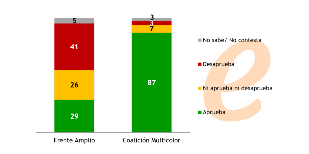 Las decisiones que el gobierno ha tomado en el marco de la pandemia por el Covid-19 parecen haber impulsado al Presidente a una “luna de miel” acentuada, con dos efectos muy claros: a) los votantes de la coalición multicolor se alinean fuertemente detrás de la figura del Presidente (aprobación cercana al 90% y casi ausencia de desaprobación en este segmento), y b) los votantes del Frente Amplio tienen juicios divididos (si bien de saldo negativo). Estos elementos permanecieron constantes entre marzo y abril.