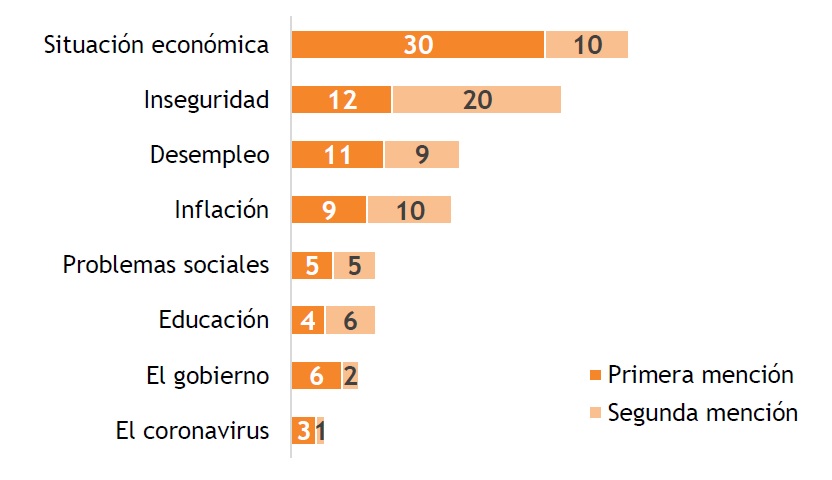 Las respuestas a esta pregunta fueron variadas. El problema más mencionado fue la “situación económica” (40% lo menciona ya sea en primer o segundo lugar), seguido por la “inseguridad” (32%), el “desempleo” (20%) y la “suba de precios e inflación” (19%). Por debajo se encuentran referencias a los “problemas sociales” (10%), la “educación” (10%) y “el gobierno” (8%), mientras que el “coronavirus” (4%) se ubica ya en octavo lugar en las preocupaciones de los uruguayos.