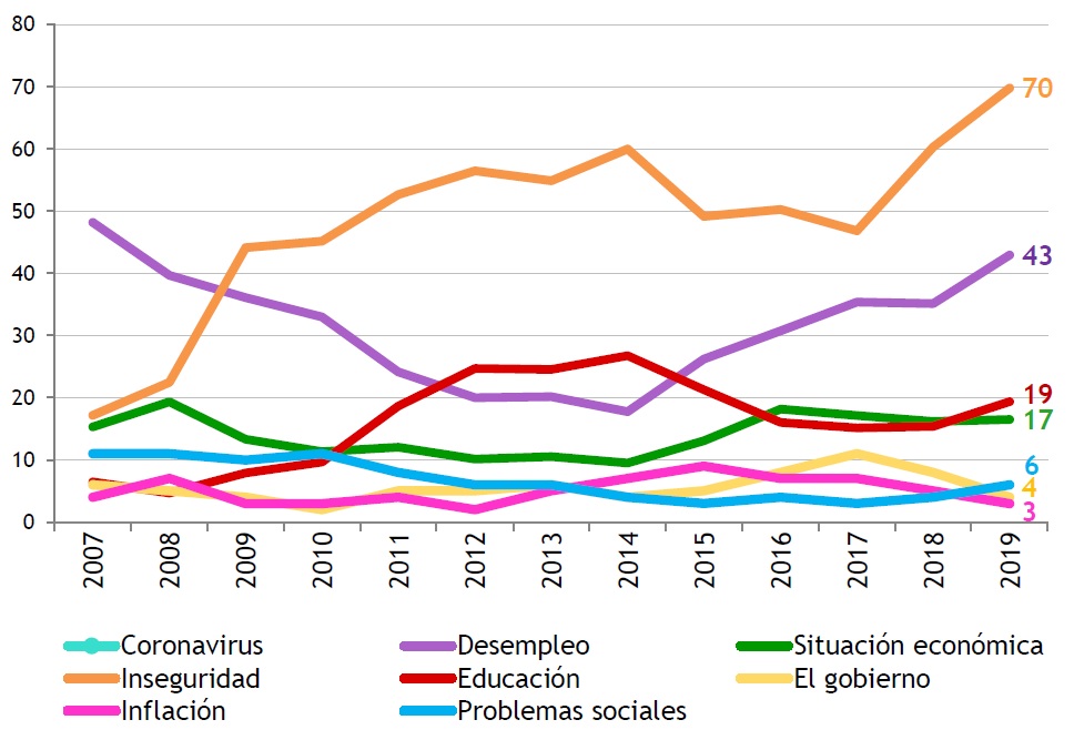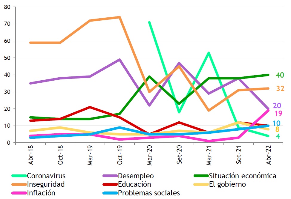 La inseguridad, que fue la principal preocupación durante una década, cae en marzo de 2020 con la llegada de la pandemia, vuelve a crecer algo con la pandemia controlada a fines de ese año, y luego se ha mantenido relativamente estable en un entorno del 40% en el último semestre.