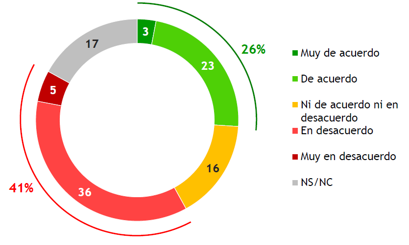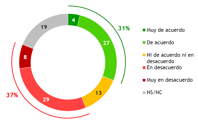Al preguntar al total de los encuestados (incluso los que declaran no conocer el tema) su opinión sobre la reforma, la estructura de juicios que se muestra es dividida de saldo negativo: un 31% está muy de acuerdo o de acuerdo, 13% no está ni de acuerdo ni en desacuerdo, 37% está en desacuerdo o muy en desacuerdo, y el restante 19% no opina. La distribución es casi en tercios entre quienes tienen postura favorable, contraria o no la tiene definida.