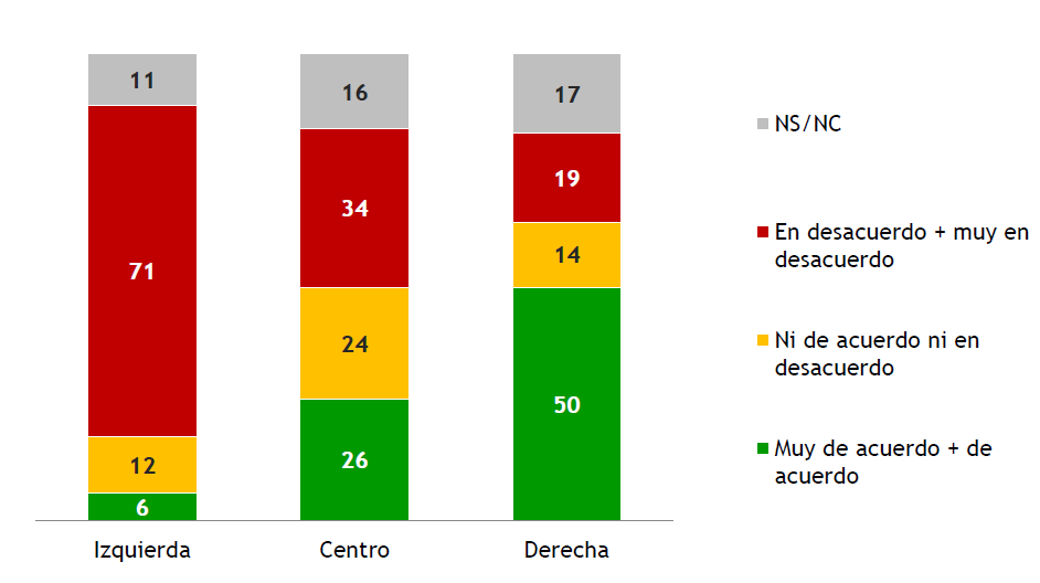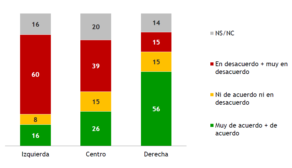 En cuanto a las diferencias ideológicas, quienes se identifican de izquierda o centro-izquierda están ampliamente en desacuerdo con la reforma (71%), mientras que quienes se identifican como de derecha o centro-derecha están en su mayoría de acuerdo (50%), pero presentan más opiniones en desacuerdo (19%) y, en general, juicios menos contundentes a favor de la reforma que los juicios de quienes se identifican de izquierda en contra de la reforma. En cuanto al centro del electorado, presenta juicios intermedios de saldo negativo similar al total de la población, un 26% está de acuerdo mientras que un 34% está en desacuerdo. Nuevamente se repite el patrón de que los electores de centro, que suelen ser menos politizados que el resto, son los que tienen menos posiciones definidas sobre la reforma. En este segmento cuatro de cada diez (40%) tiene opiniones intermedias o no opina sobre esta reforma.