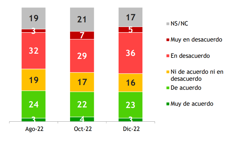 Los datos parecen mantener una estructura similar a lo largo del tiempo. En todo el segundo semestre de 2022 se ha encontrado un escenario dividido de saldo negativo, más allá de que los juicios contrarios a la reforma se incrementaron levemente en diciembre (de 36% a 41%).