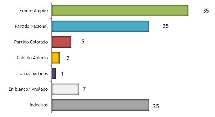 El Frente Amplio lidera las preferencias (35%) seguido por el Partido Nacional (25%) y, más lejanamente, por el Partido Colorado (5%) y Cabildo Abierto (2%). Hay un alto nivel de indecisos (25%) y de voto blanco o nulo (7%).